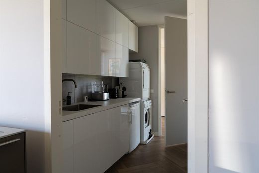 De woning (17 meter breed en 9 meter diep) is gesloten van voren, het huis opent zich naar de tuin. De entreehal ligt centraal in het huis, deze is verbonden met de woonkamer. De hal grenst aan een toilet en de meterkast. De glazen pui is 12 meter breed doorlopend in het (onderheide) betonnen terras met de houten overkapping. De werk (slaap) kamer aan de achterzijde staat in open verbinding met de woonkamer zodat je de volledige breedte van het huis kunt ervaren. De b3 keuken van Bulthaup heeft een eiland. De twee ovens en de afwasmachine zijn van Gaggenau. Luxe elementen als een biofrost-ijskast (liebherr), stoomoven en Bora onder-afzuigsysteem en qooker kraan maken deze plek een feest voor alle kookliefhebbers. De keuken komt uit op een bijkeuken met nog een aanrecht, vriezer, wasmachine en veel extra opbergruimte. Van daar uit is de installatieruimte bereikbaar of je loopt weer door naar de hal.